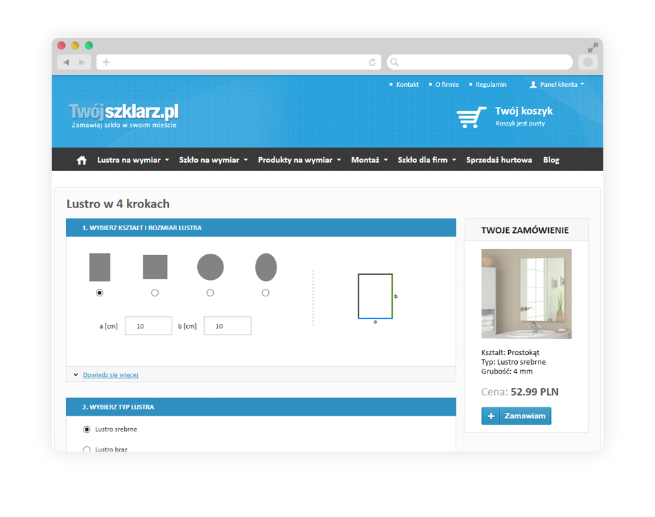 TwojSzklarz makes us proud of being programists. It is a portal that allows for ordering custom type of glass without leaving home. We have created everything, including advanced module for glass customization.